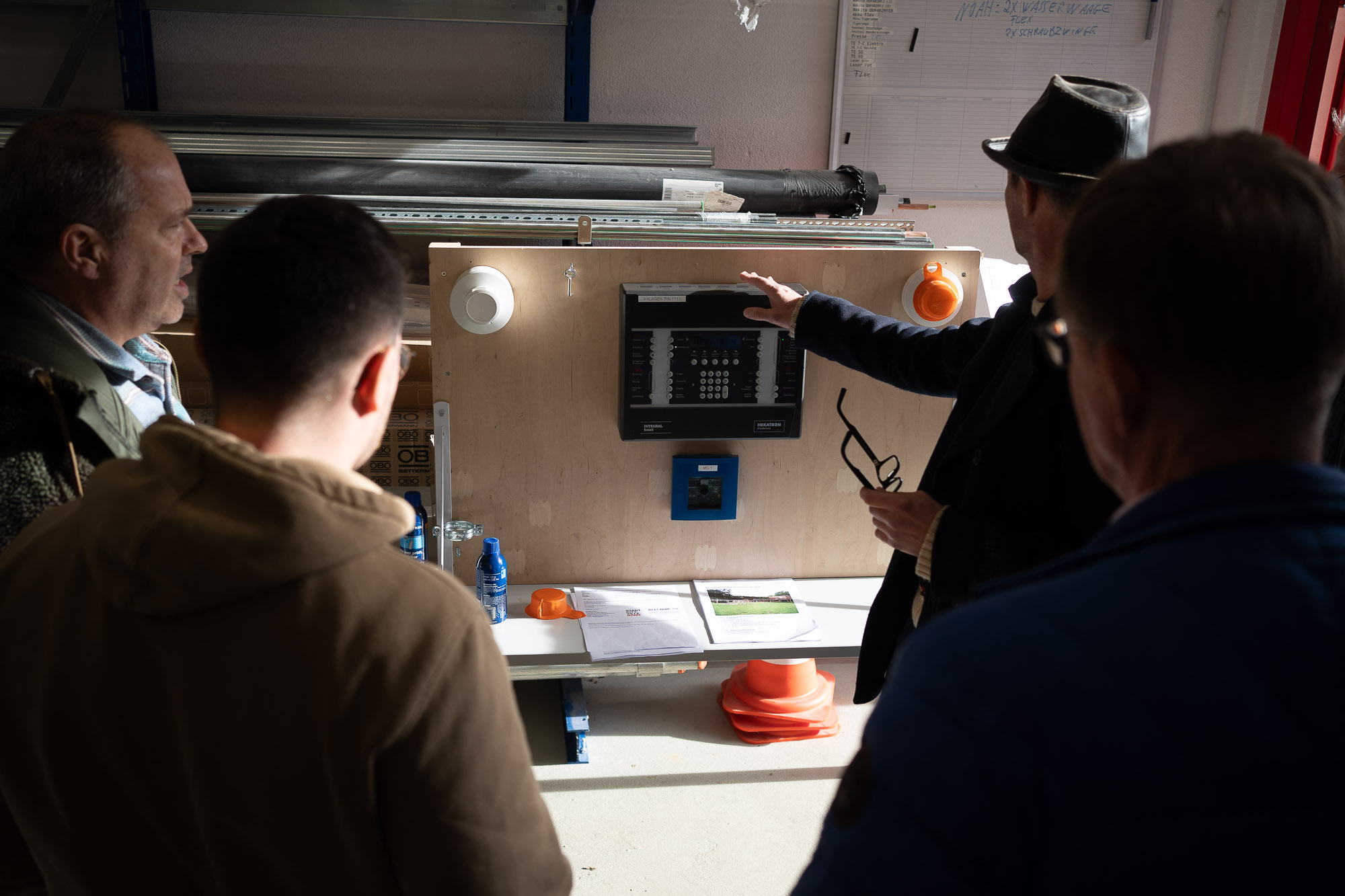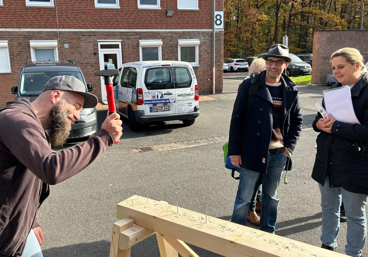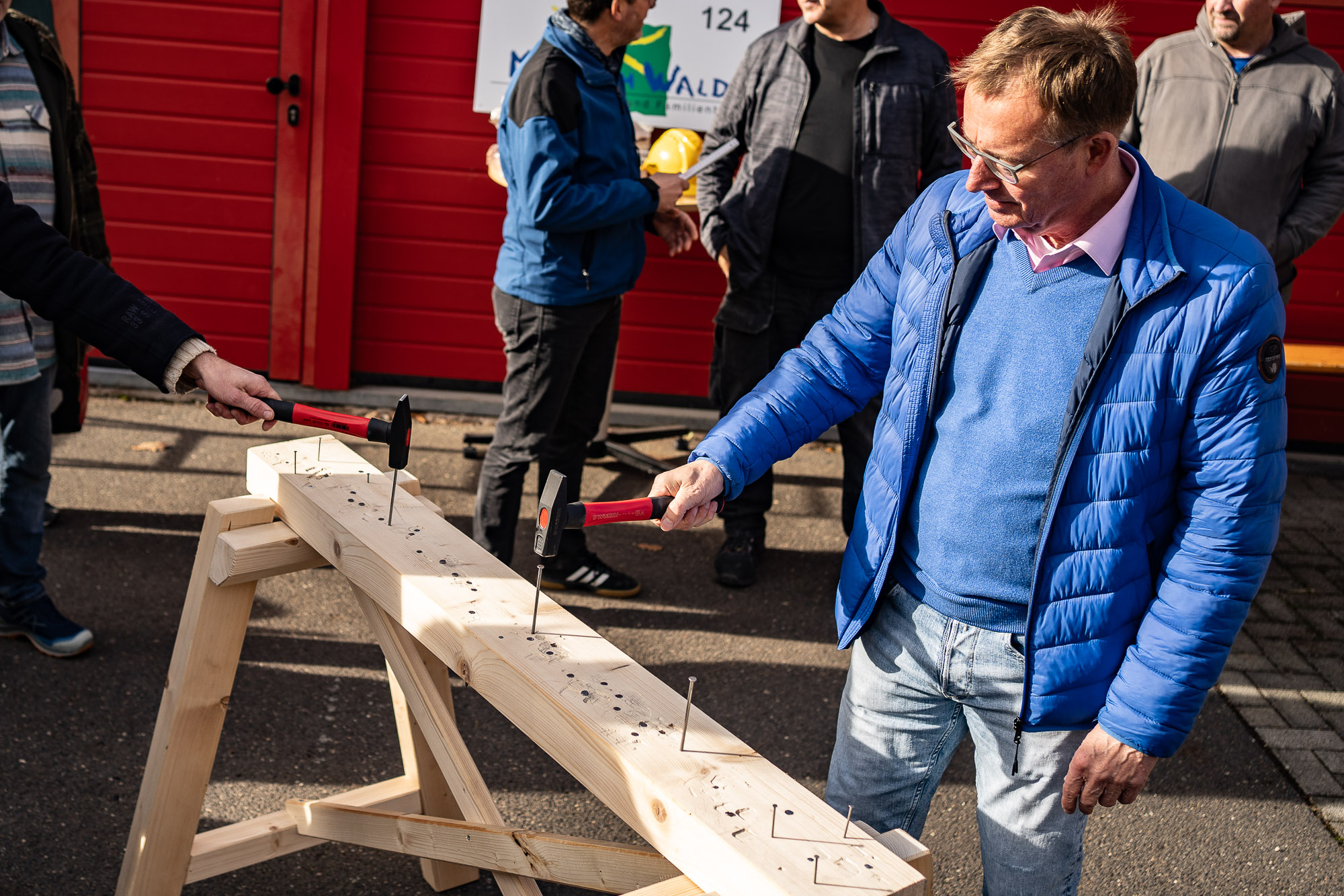 Wer wollte, konnte seine Kräfte beim Nagel-in-den-Balken-Schlagen messen – als Belohnung winkte ein exklusiver MIW-Zollstock! Bei einer „Führerscheinprüfung“ des Fahrdienstes konnte man sich kostenlos der Illusion berauben lassen, dass 25 Jahre Fahrpraxis vollkommene theoretische Souveränität bedeuten. Und wer Technik zum Anfassen mochte, konnte sich von unseren Fachleuten eine Brandmeldeanlage erklären lassen.