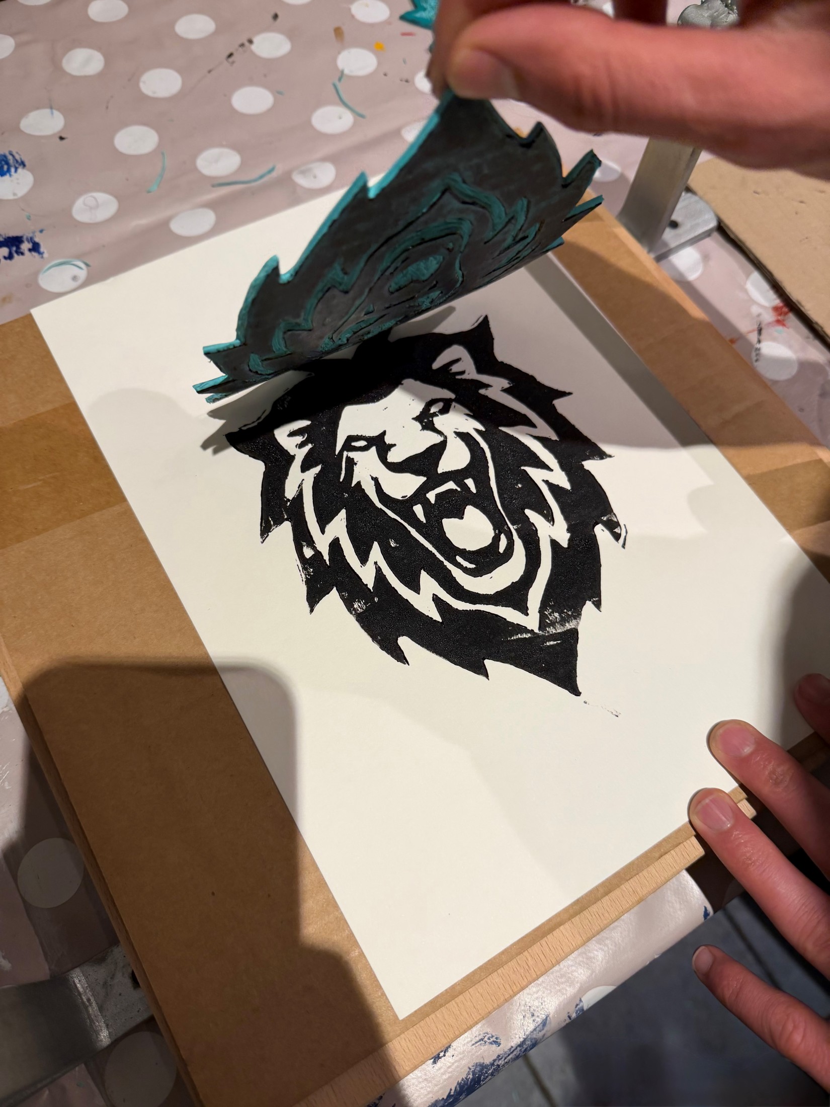 Mit viel Ideenreichtum sind dabei ganz individuelle Motive entstanden. Schritt für Schritt ging es vom ersten Entwurf bis zum fertigen Druck: Zuerst suchten sich die Jugendlichen ein Motiv aus und übertrugen es mithilfe von Transparentpapier auf eine Linolplatte. Danach wurde geschnitzt – alle Flächen, die später keine Farbe annehmen sollten, wurden sorgfältig entfernt. Anschließend kam Farbe ins Spiel: Mit einer Walze wurde die Linolplatte eingefärbt. Zum Schluss wurden die fertigen Motive auf Papier und Jutebeutel gedruckt. Die Bilder zeigen Eindrücke aus dem Projekt und machen den kreativen Prozess gut sichtbar.